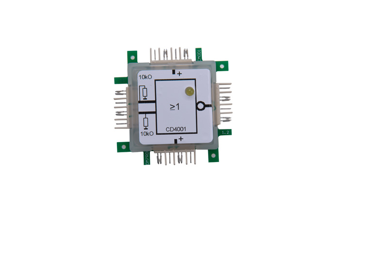 Pieza NOR lógica (O con salida negada) basado en 1/4 del CMOS ICs CD4001. Alimentación 9V.